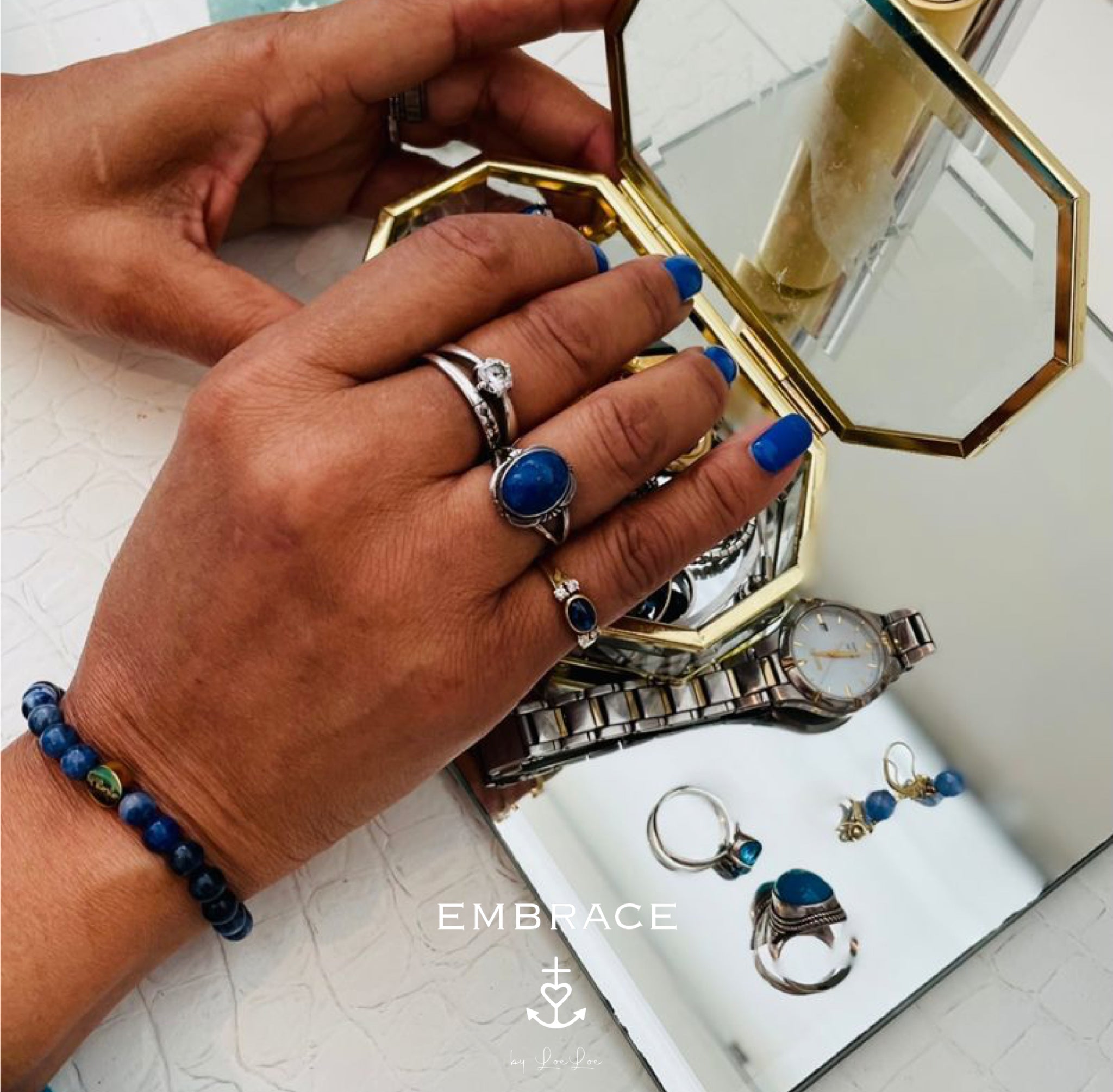 Deze prachtige Sodaliet edelsteen armband is uitgevoerd met 6 mm hoge kwaliteit natuursteen kralen en een bedel met het logo “by Loeloe.”